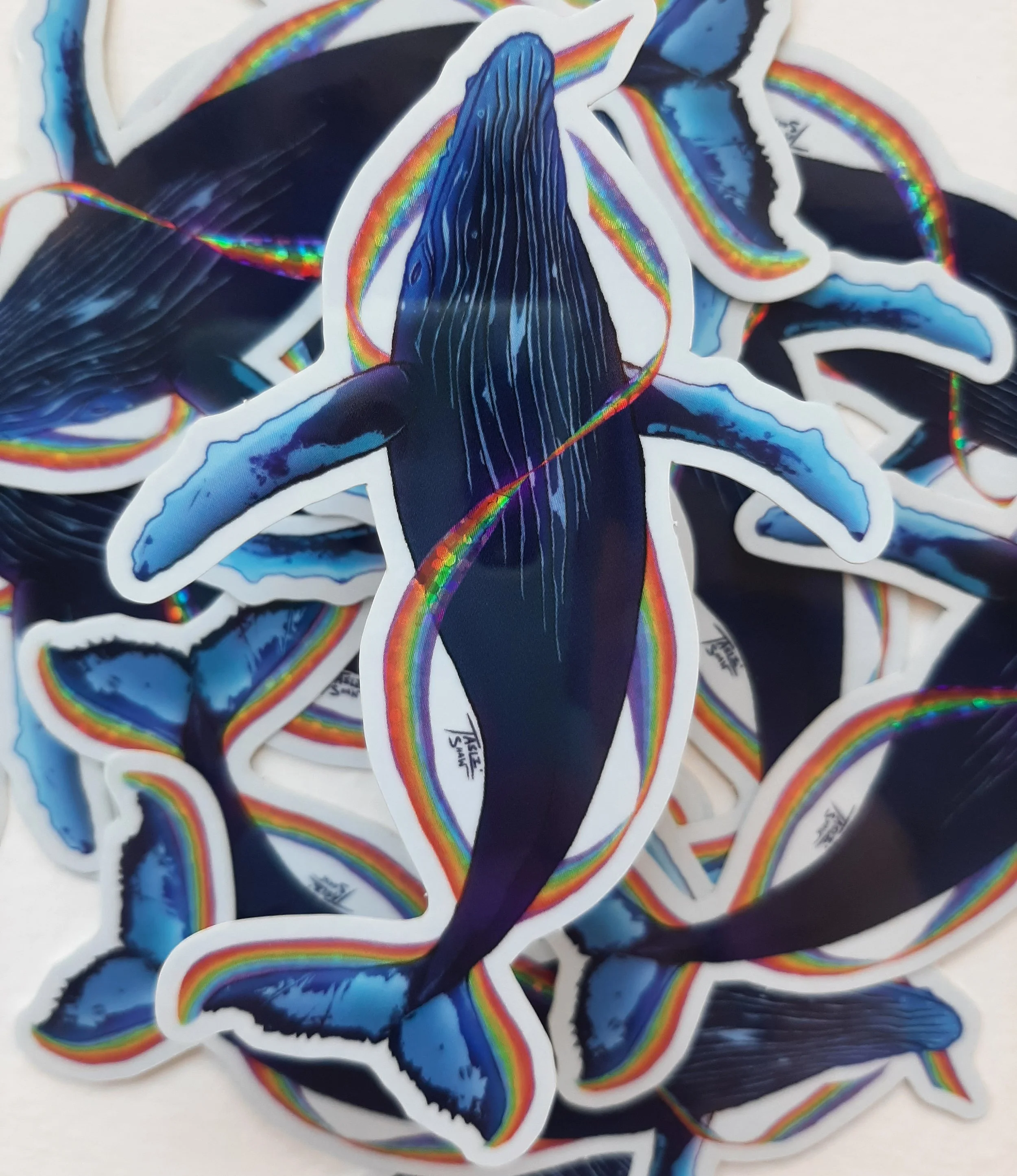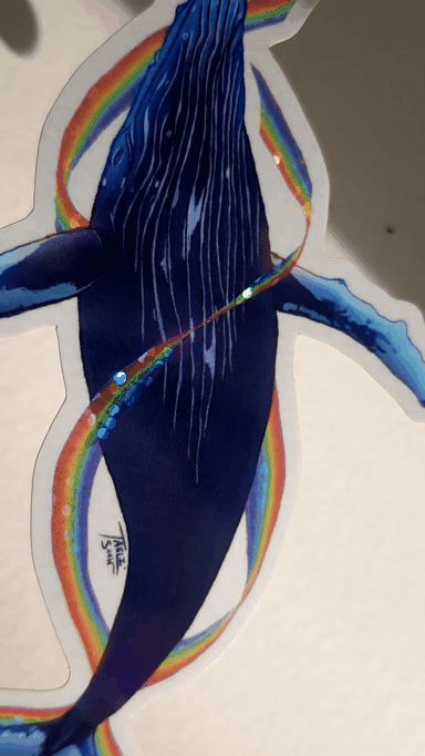 Local Salish Sea Humpback Whale “Split Fin” swimming through a glittery rainbow.